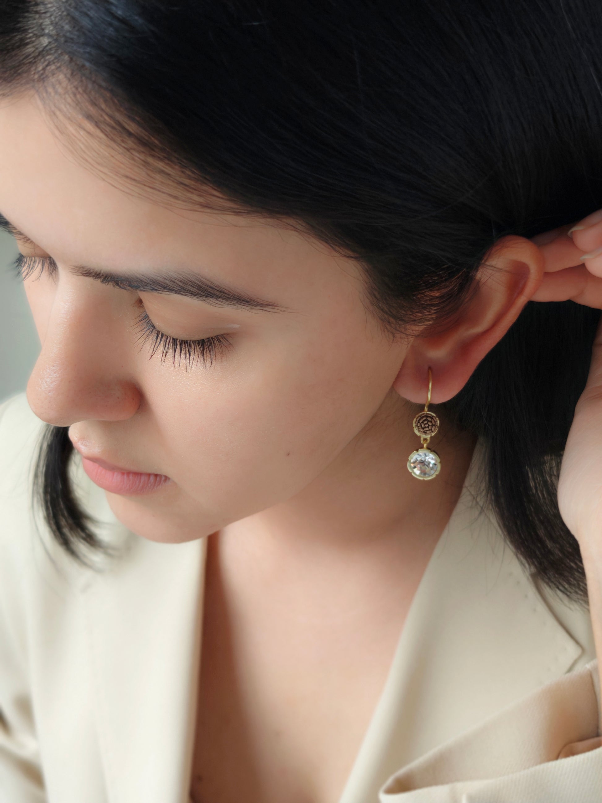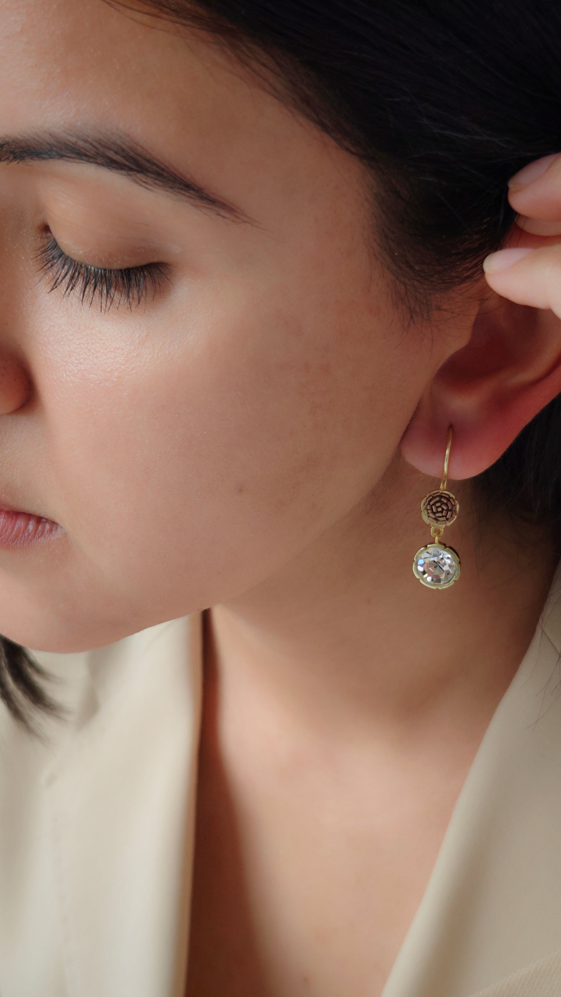 Handcrafted in High Quality Brass, the elegant Masie earrings feature our signature intricate embroidery nestled in unique flower-shaped bezels that are lightweight and perfect for an understated statement. Available in muted neutral colors, they transition seamlessly from casual to formal.
