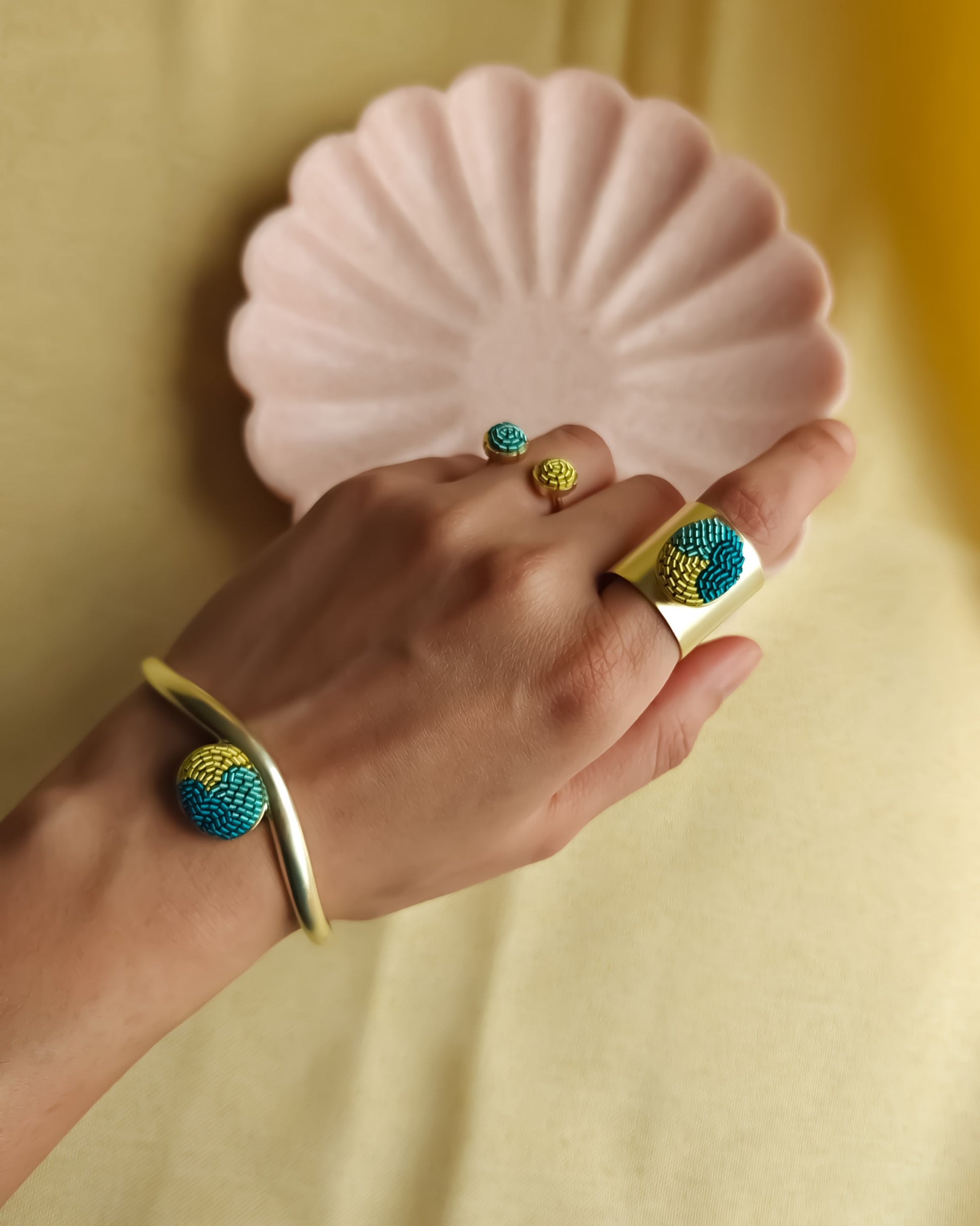 The Reverie Bracelet showcases the tranquil patterns and harmonious color blends found in nature, which serve as our primary inspiration. Drawing from tropical blues, the soft hues of pink sunset skies, the depths of night, and the rich colors in your cappuccino, we have crafted these unique designs. To enhance their beauty, we have incorporated a sculptural, organic open cuff bracelet shape. This pairs beautifully with Reverie Pearl Drop Earrings.