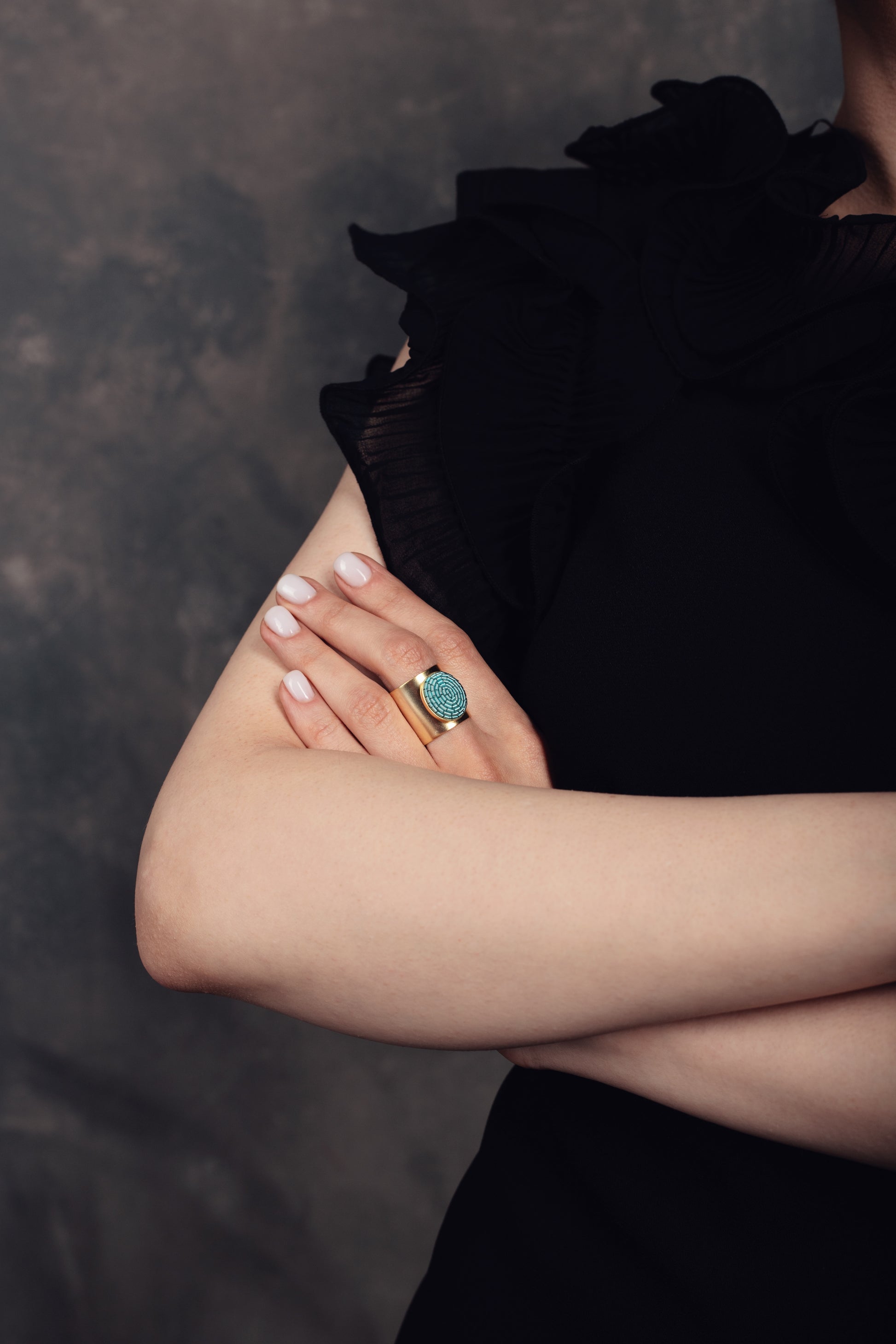 Handcrafted in High-Quality Brass, Thea Ring is your next style statement. With its bold brass band and our signature oval embroidery motif at the heart, it's a subtle power move. Plus, with a flexible band designed for ease and comfort, it's a breeze to wear. Whether you want to stack it up or keep it simple, Thea is versatile enough to match your unique fashion vibe.